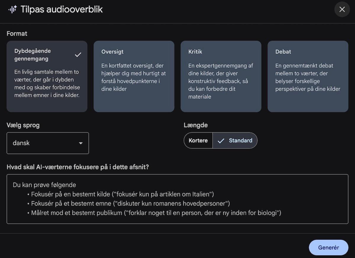 Som altid med Google er processen ekstremt enkel: Du klikker bare på “Opret ny notebook” i NotebookLM, uploader din kilde som PDF eller tekstfil – og vælger “Lydoverblik.” Derefter kan du bestemme, om du vil have en kort opsummering, en dybdegående gennemgang, en kritisk analyse eller en mere debatbaseret version. Du vælger selv sprog, længde og fokusområder – og så klarer NotebookLM resten.