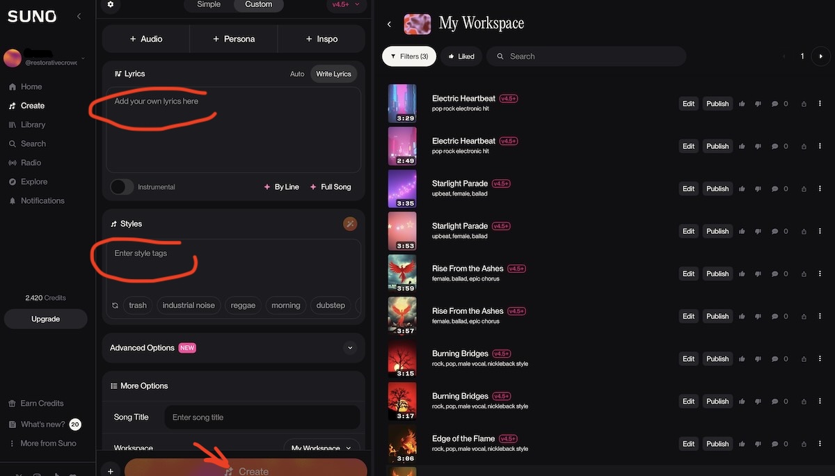 Det væsentligste felt er "Styles". Her skriver du nogle få ord som beskriver musikstilen for det du gerne vil producere. Det kunne være "pop, male singer, upbeat, bass heavy" fx. Eller "ballad, female singer, epic film music" Du kunne også bare skrive "Rock" og intet andet og se hvad algoritmen giver dig. Når du har tastet et par nøgleord til din musik er det bare at klikke "Create" og vente et minut eller to på resultatet. Du får to sange hver gang, og jeg lover at du bliver overrasket over kvaliteten!